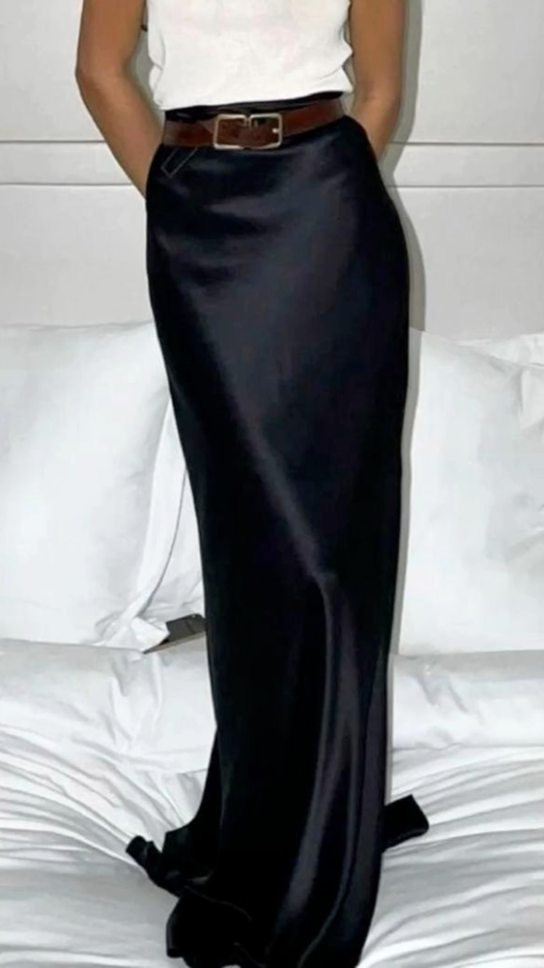 Satenska suknja krojena tako da ti stvarno padne do poda. Elegantna silueta koja prati tvoje linije, bez potrebe za “produživanjem” ili kompromisima. Visok struk, pun sjaj i dužina koja pokriva zglob — baš kako si oduvek želela, ali retko nalazila.